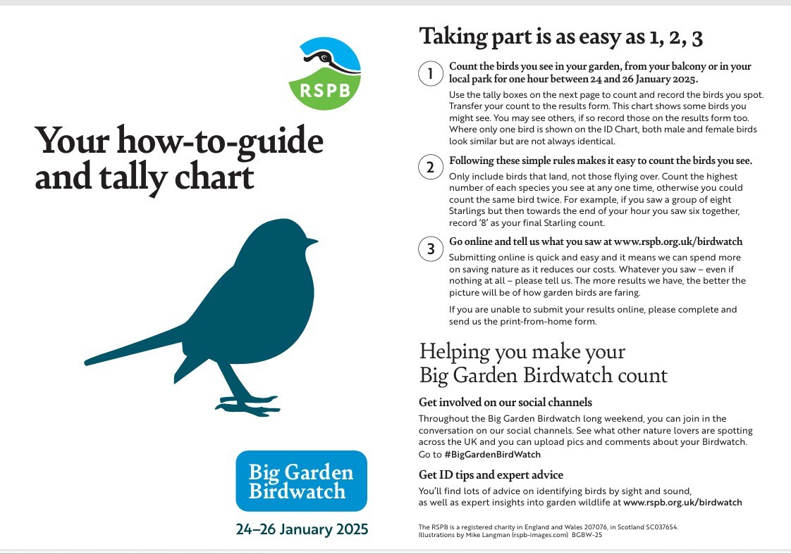 Its easy to be part of the Big Garden Birdwatch. Simply choose an hour between 24 – 26th January, 2025 and count the birds you see in your garden, from your balcony, or in your local park (or in our case…Churchyard) Only count birds that land on the feeder or on the ground . Wrap up well if you are going to be outside. if you have no means of reporting back to the RSPB – tell one of the Green Team who are signed up for the Birdwatch and Im sure they will be able to pass on the information to the researchers.