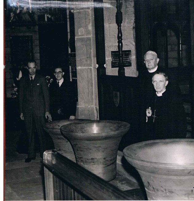 Saturday August 3rd, 1946: Photo taken on St Oswald’s Festival Day, after a ceremony to re-dedicate the newly recast church bells, the bells were placed across the chancel from pulpit to lectern. With the