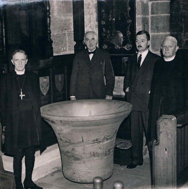 Interior of the church on the day the church bells were re-dedicated, from the left are Reginald Rawnsley, Rector’s Warden William Brooke, Archdeacon Lowe Rector of Guiseley and the Right Honourable Bishop Stanton Jones DD.